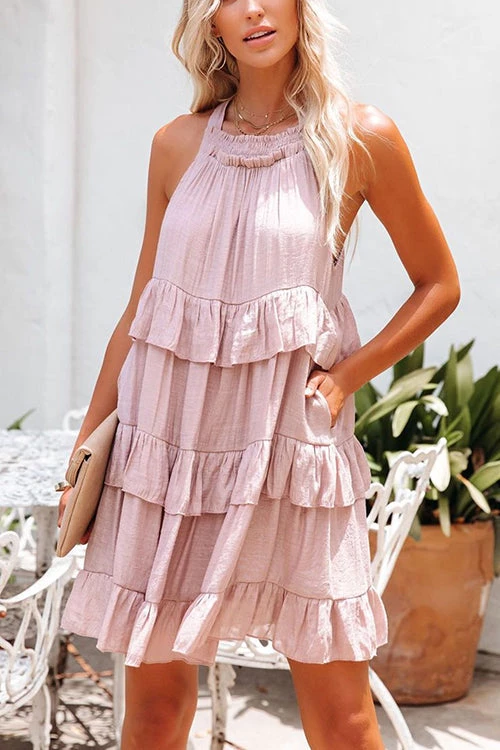 A relaxed, halter neck dress with tiered detailing. Dress features pockets and is fully lined.
