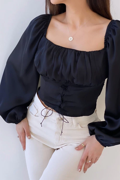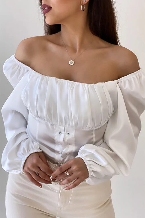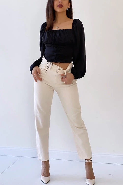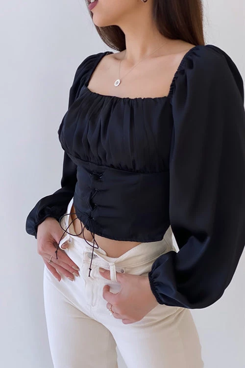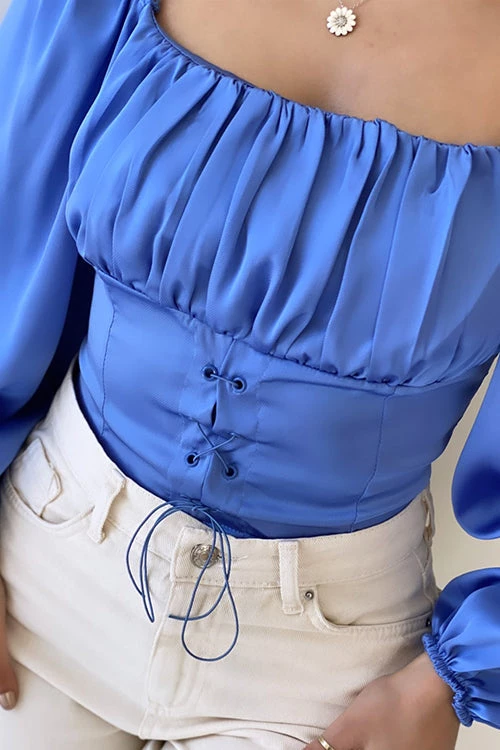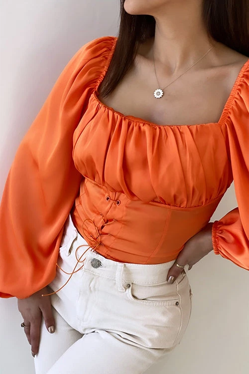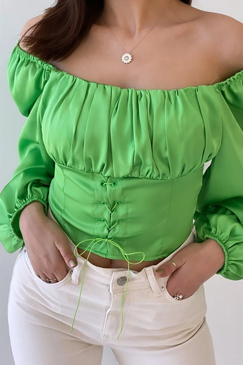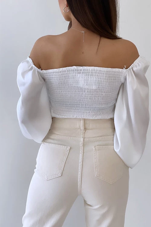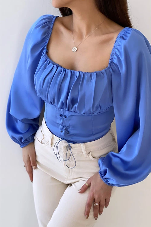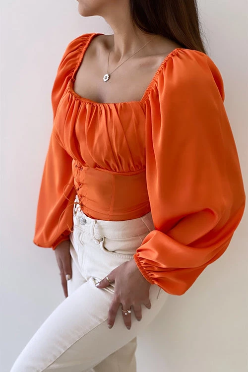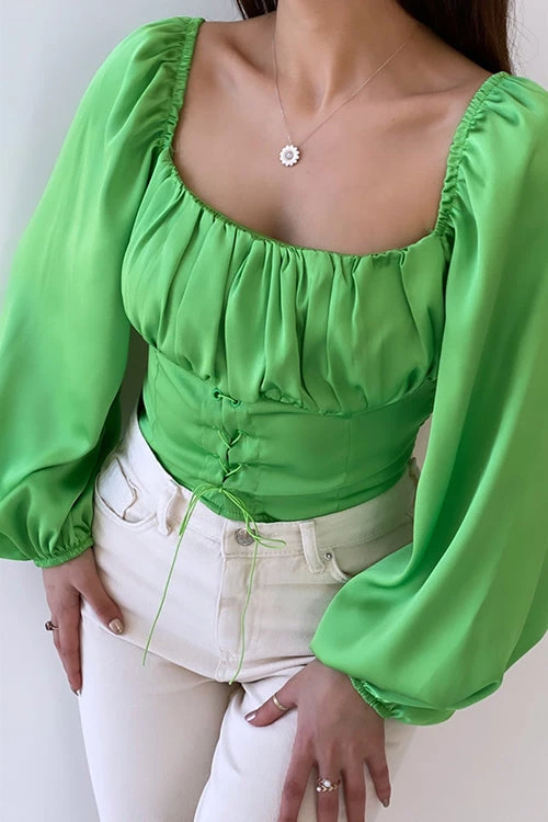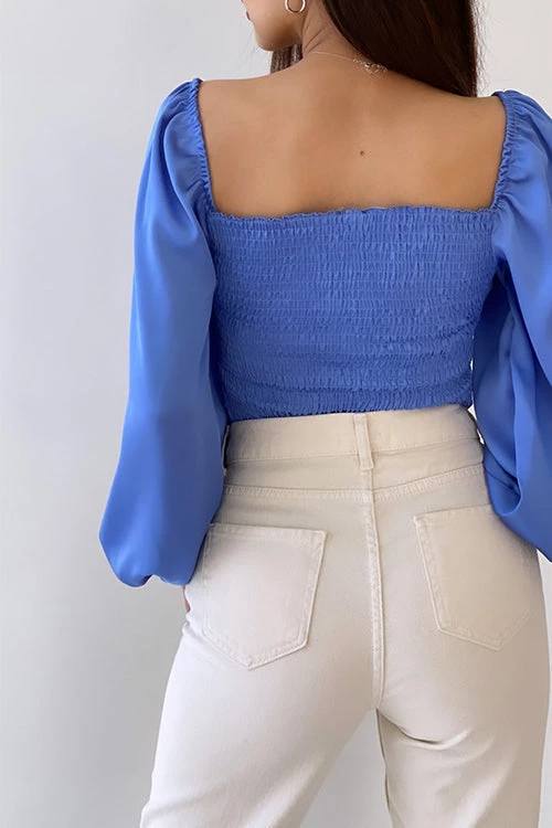 Our top is a classy staple, featuring a milkmaid neckline, elastic shoulders, ruched stretch waist, ruffle trim hem, ruche cuffed balloon sleeves and light satin texture! We love the bright spring-forward color and comfortable stretchy fit. Pair with denim, mini skirts and more!