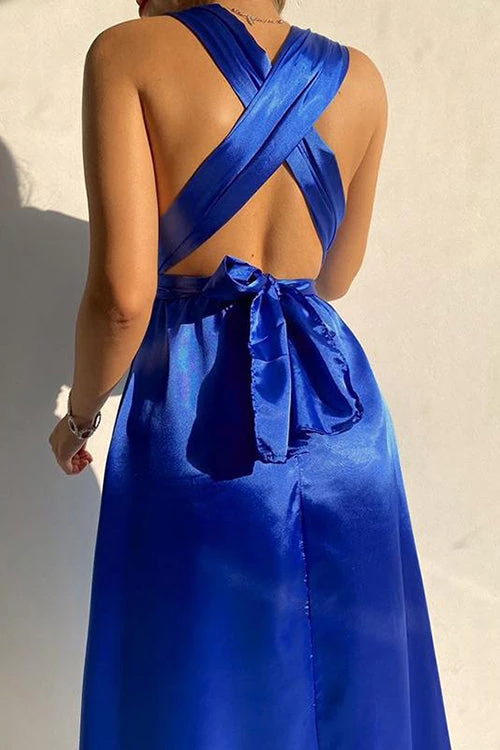 Get ready to be announced prom queen. This multi-way dress will having you making more costume changes than Mariah Careyâ€?all with the one elegant dress! This style has a tie up bust, and it’s made from smooth, satin-y fabric.  We love wearing ours with an up-do and a gold smokey eye!