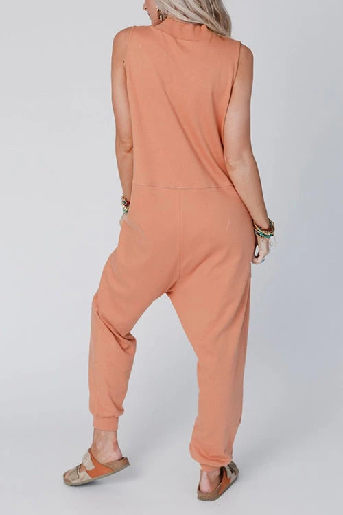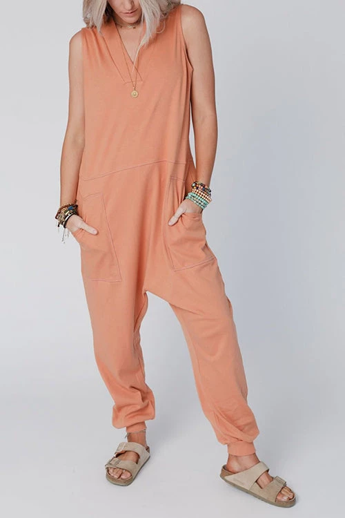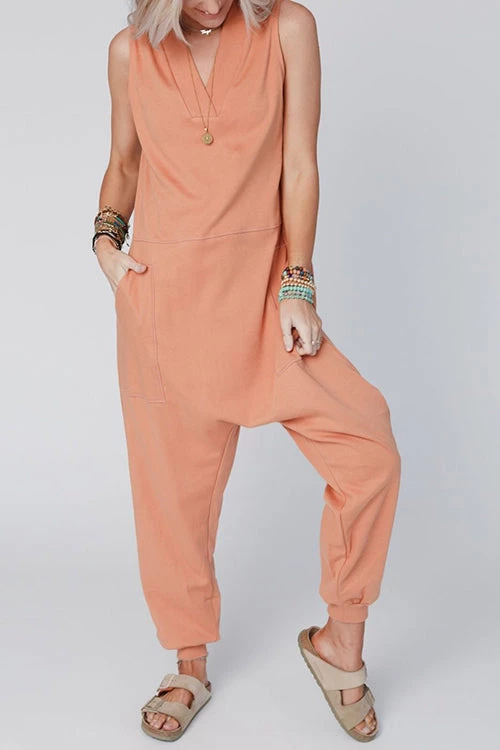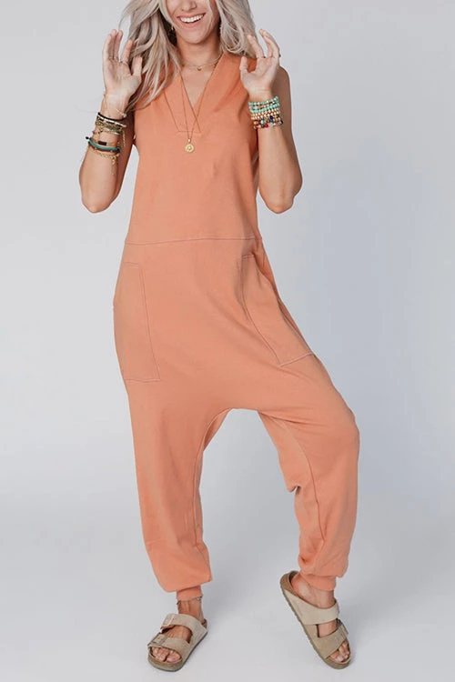 This jumpsuit is perfect ladies! It’s very comfortable and loose fitted! This is a look ladies 😍 I absolutely love the fit! We hold it in a sleeveless version – perfect timing for the warmer seasons! It is featured in a comfortable mid-weight fabric with a relaxed fit, a v-neckline, no sleeves, pockets, and a Jogger/Harem pant leg silhouette. So comfy and cute we can’t get enough!