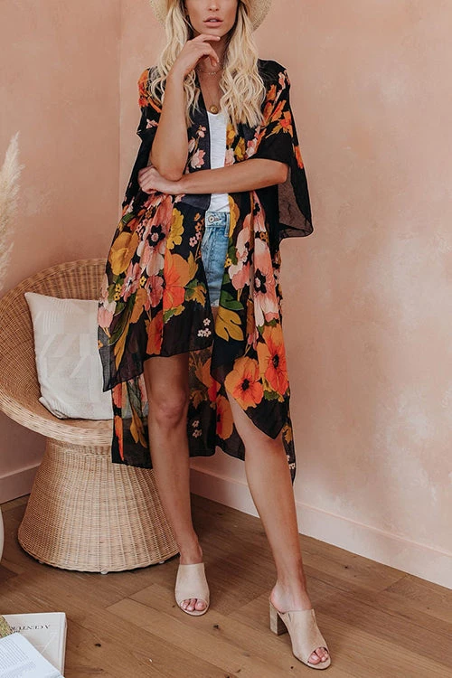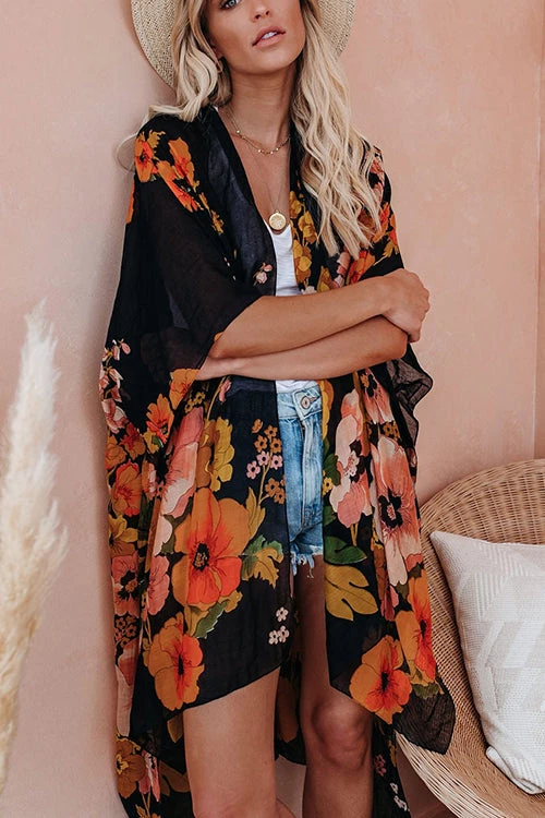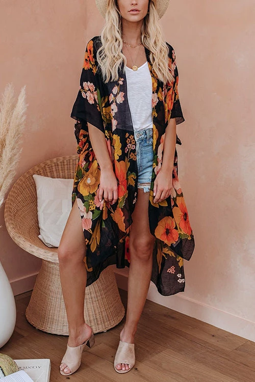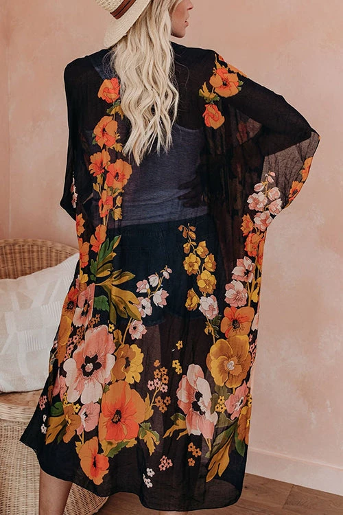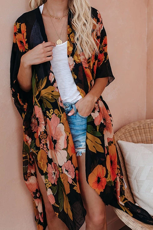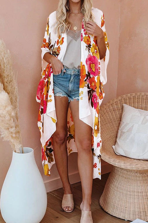 Step your look up a notch in our Shady Beach Floral Kimono! Printed with pink, sage, brow, golden yellow, magenta and pink florals on a sheer off white base. The open front design, side slits and kimono sleeves add volume to the effortless layer